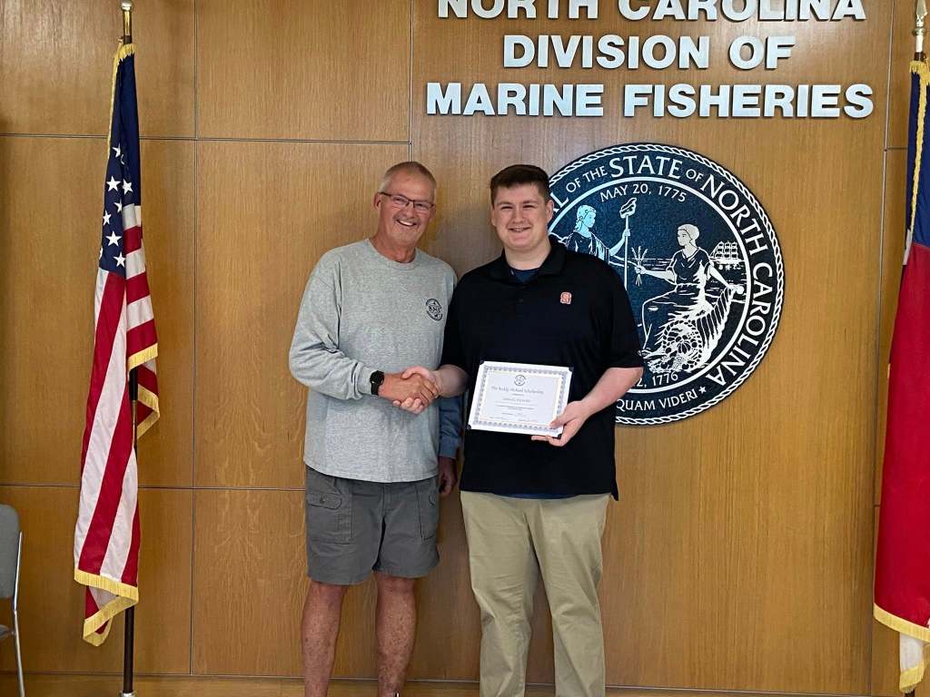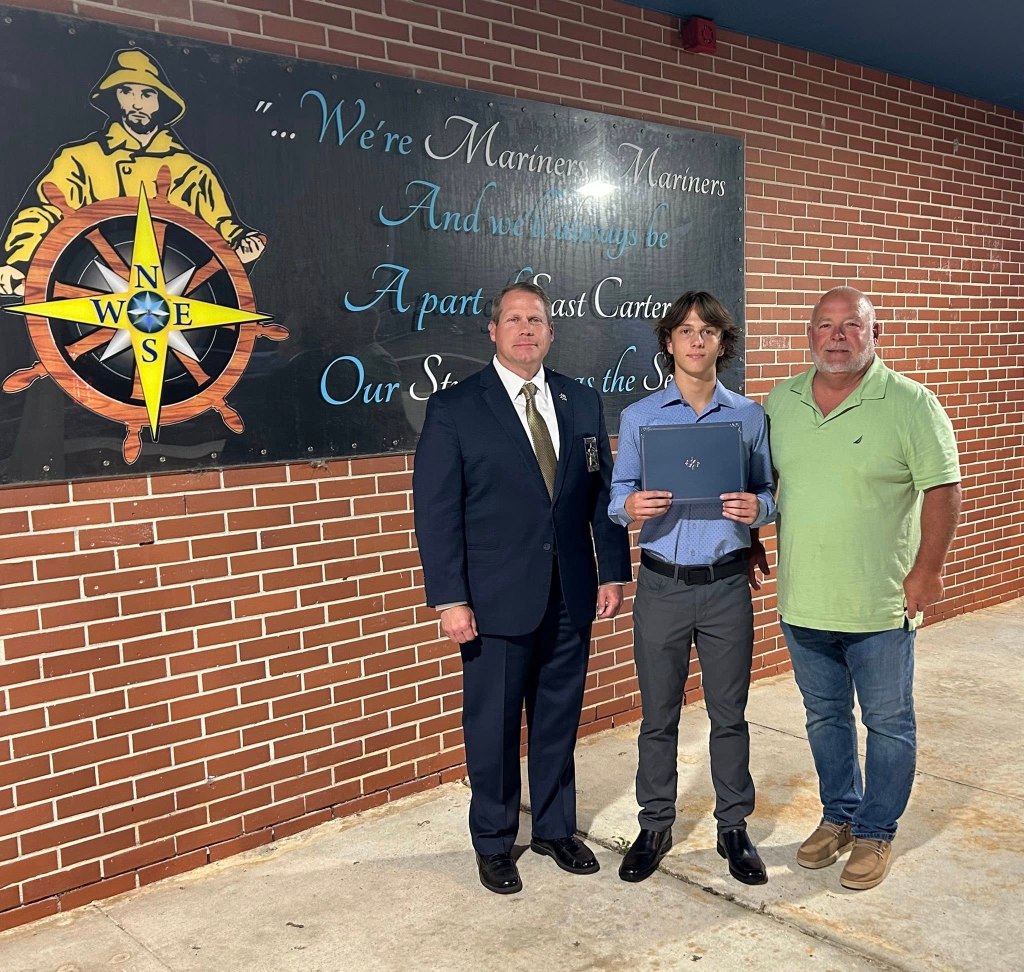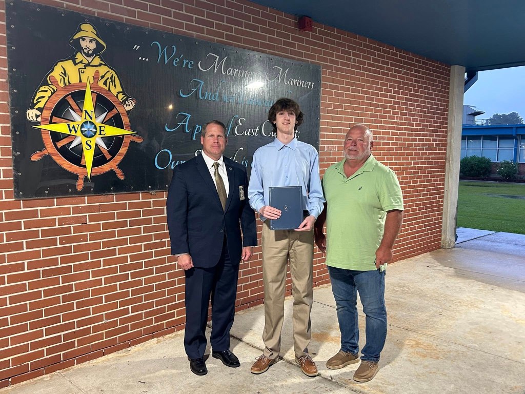 East Carteret High School recipient Braydon Johnson with Sheriff Asa Buck and Board Member Franklin Fulcher
