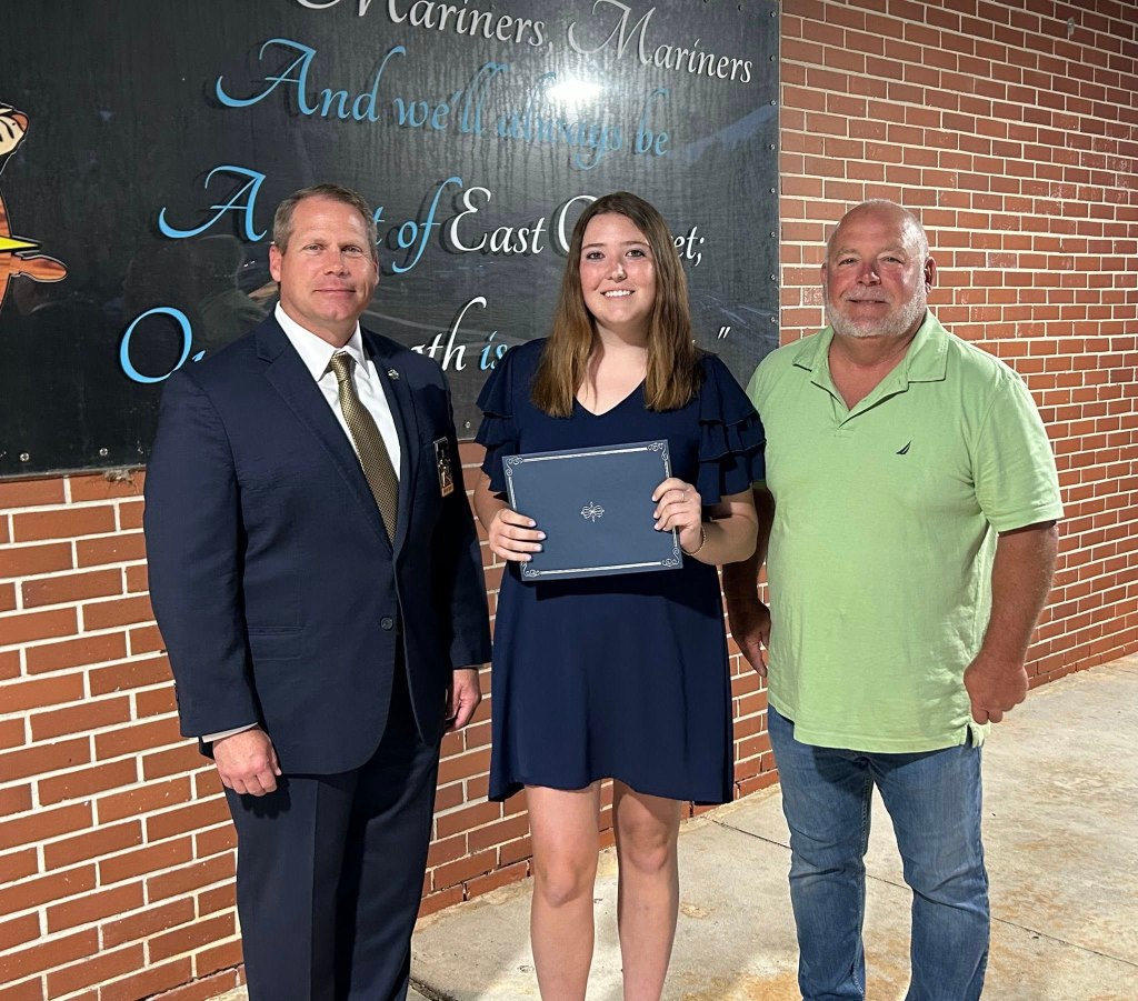 East Carteret High School recipient Hailey Pittman with Sheriff Asa Buck and Board Member Franklin Fulcher
